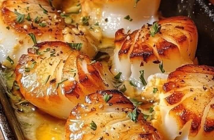 In a small bowl, mix the melted butter and minced garlic. - Arrange Scallops: