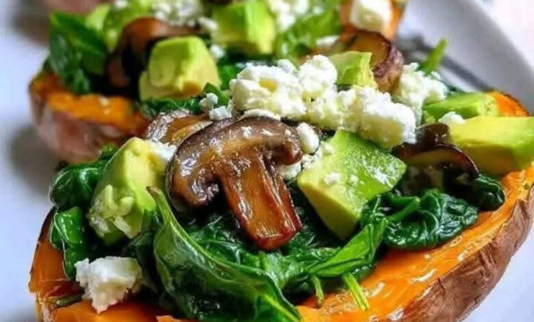 Stuffed Sweet Potatoes with Spinach, Avocado, Mushroom & Feta